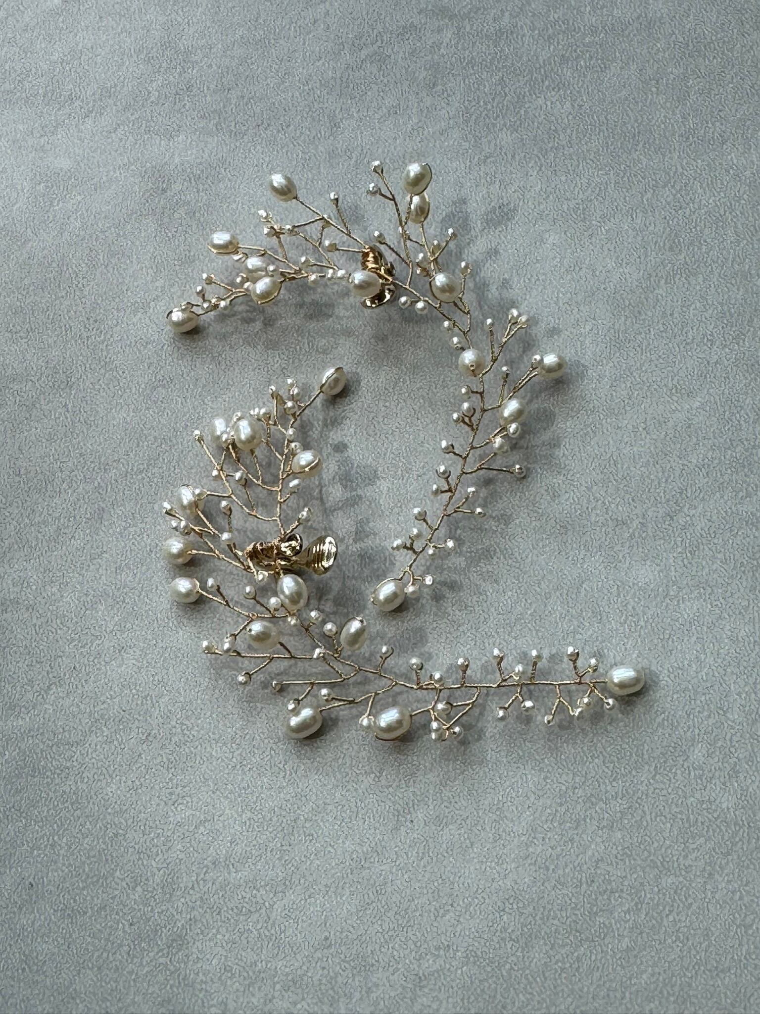 風に揺れる葉や枝の柔らかな流れにインスピレーションを得て、細いワイヤーと淡水パールのみで作られたボタニカルジュエリーです。